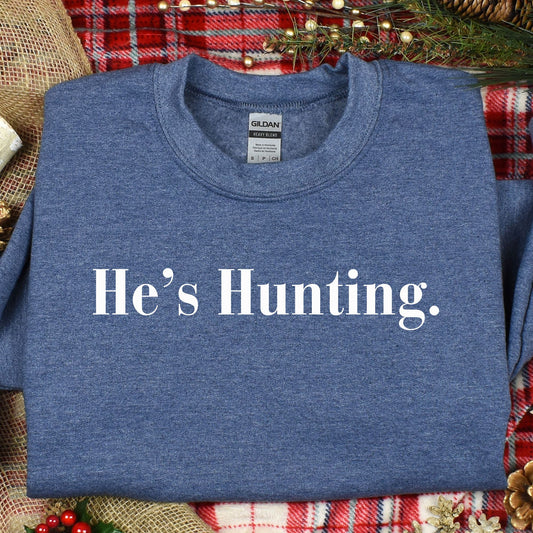 He's Hunting. Gildan Unisex Heavy Blend™ Crewneck Sweatshirt - Cozy Casual Outdoor Wear